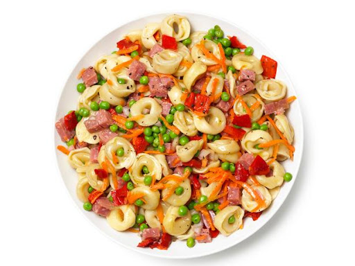 Add the salami, carrots, peas and roasted red peppers to the bowl with the tortellini.