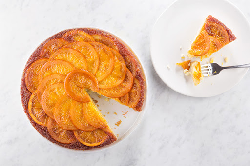 Starting in the center of the pan, layer the orange slices on top of the caramel, overlapping a bit and working your way toward the outer edge (you may not need to use all the orange slices). Set pan aside.