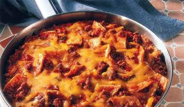 2. Stir the soup, salsa, water, tortillas and half the cheese into the skillet.