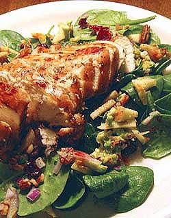 4.Meanwhile, assemble spinach, cranberries, pecans, apple, onion, carrot, and avocado onto two salad plates and chill.