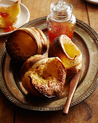 Brush the cups of a muffin tin (preferably not nonstick) with the remaining 1 tablespoon of melted butter and heat the muffin tin in the oven for 5 minutes; the butter will turn a nutty brown. Carefully fill the muffin cups halfway with the popover batter. Bake the popovers for about 30 minutes, until they are risen and browned. Turn the popovers out onto a serving platter and serve them right away.