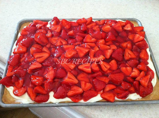 Then mix strawberries with glaze of your choice (or even just mix strawberries with sugar and let sit overnight in fridge and they would work) and pour the mixture over the top and chill for about four hours or more.
