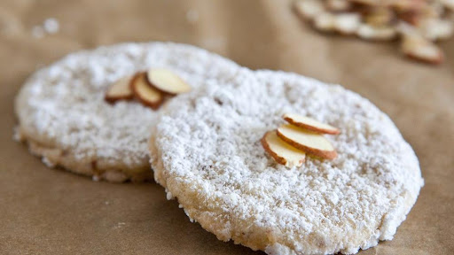 While cookies are still warm, dust evenly with powdered sugar. Garnish tops with sliced almonds.