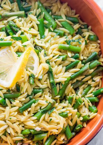 Drain orzo, but do not rinse it. Place the hot orzo in a large bowl, add the asparagus and parsley. Whisk the dressing if needed and pour it over the salad. Mix well.
