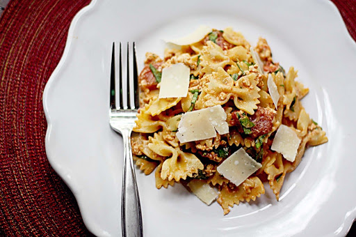 2. While the pasta is cooking, heat 1 Tablespoon of olive oil in a saute pan over medium-high heat. Add ground chicken, salt, oregano, and pepper. Cook until chicken is browned and fully cooked about 5 to 8 minutes. Move to a plate and cover with foil until ready to use.