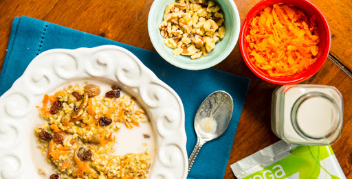 Once oats have finished cooking, top with chopped walnuts and drizzle with maple syrup.