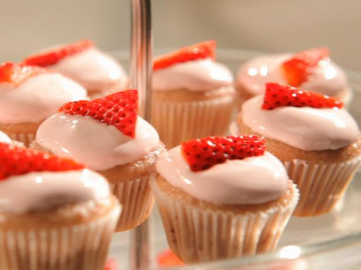 Rest a heat-safe mixing bowl over a pot of boiling water. In the bowl, combine all of the frosting ingredients except the vanilla and food coloring. Beat with hand mixer on medium speed, while mixture cooks, until peaks are formed when the beaters are lifted out of the bowl, about 7 minutes. Remove the bowl from the heat and add vanilla and red food coloring to the desired pink shade. Frost the cooled cupcakes with the colored frosting and garnish each with a strawberry slice.