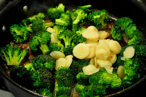 Stir-fry broccoli in oil over medium-high heat for 5 minutes. Add water chestnuts and their liquid. Cover, reduce heat and steam until broccoli is crisp-tender, 3to 5 minutes. Season with soy sauce and ginger to taste.