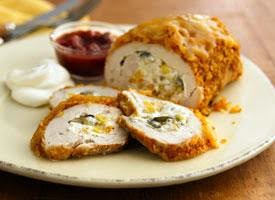 Flattened chicken breasts with a crunchy coating hold a delicious cheesy filling.