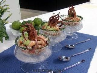 8- Colocar en una copa la preparación de cazón, una cucharada de salsa y disponer un tentáculo de calamar.