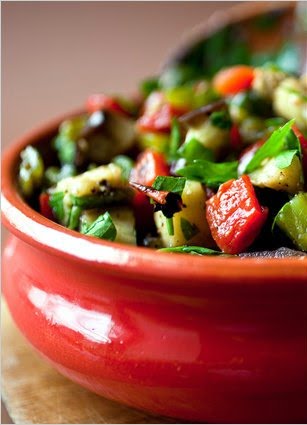 - Many versions of this salad are made throughout the Mediterranean. This one, slightly spicy, is North African. When grilling whole eggplants, seek out smaller ones, as they will grill more quickly and evenly than the large, bulbous ones.