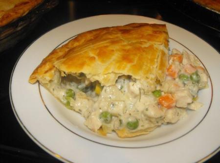 3. In the same pan, melt butter or margarine over medium heat. Add the onion and celery. Saute, stirring, for 3 minutes. Stir in flour until well blended. Gradually stir in stock mixture and the herbs. Simmer, stirring constantly, until the sauce thickens and boils. (you will think this is TOO MUCH liquid, but it's not). Add the chicken and vegetables to the stock and stir to combine. Line a deep pie dish with one of the pastries and pour mixture in, almost to the top.
