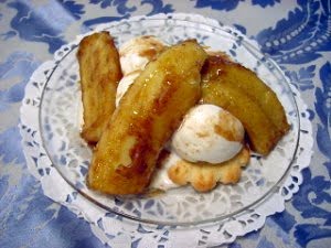 Continue to cook the sauce until the rum is hot, then tip the pan slightly to ignite the rum. When the flames subside, lift the bananas out of the pan and place four pieces over each portion of ice cream. Generously spoon warm sauce over the top of the ice cream and serve immediately.
