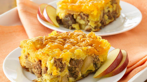 In 12-inch skillet, cook sausage over medium-high heat 5 to 7 minutes, breaking up with spoon, until no longer pink; drain. Stir in pie filling and apples. Spread mixture evenly in baking dish. Top with 1 cup of the cheese.