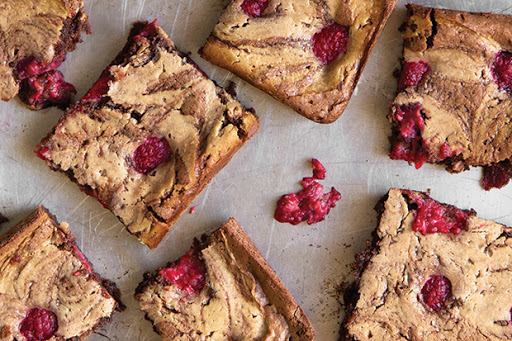 For the cream cheese layer: In a medium bowl, stir together cream cheese and remaining 2 tbsp butter until smooth and thoroughly combined. Add remaining 2 tbsp sugar, remaining egg, and jam and mix well. Stir in remaining 1 tbsp flour and remaining 1/2 tsp vanilla. Dollop mixture onto batter in pan. Use a butter knife to swirl cream cheese mixture into brownies. Press fresh raspberries into the top.