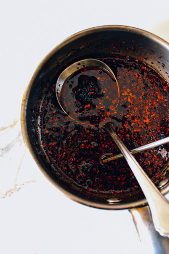Add the crushed red pepper flakes and allow them to steep in the hot oil. It should start smelling fragrant, almost like popcorn. Allow the oil to cool completely then store in a glass jar and keep refrigerated.