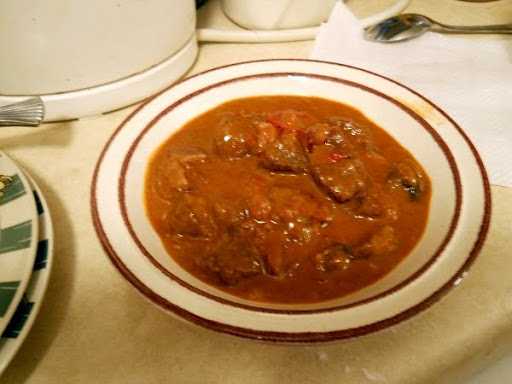 Toss beef chunks in flour; brown well in frypan, adding more oil if necessary; add to vegetables. Mix paprika well into meat and vegetable mixture; stir in stock and bay leaf; bring slowly to a boil.