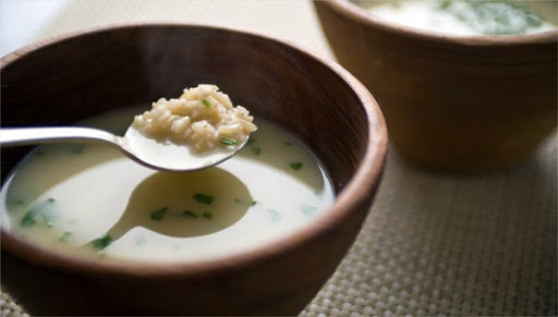 1. Bring the garlic broth to a simmer and season as desired with salt and pepper. Add the rice and simmer until tender, about 15 minutes.