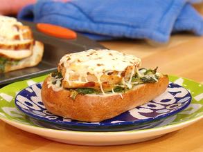 Fill bread shells with some greens, and top with chicken and grated provolone and mozzarella cheeses.