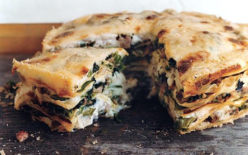 Make 5 more layers each of crespella, filling, and sauce (end with a layer of sauce). Sprinkle cheese mixture evenly over top.
