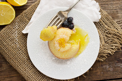 (*Alternate filling method if you don’t have a piping bag – fill each ramekin about 1/3 full. Using a spoon, make a well in the middle by pushing the batter away from the middle to the sides. Place 1 Tbsp. or so of the chilled lemon curd in the well that you made, then gently cover the curd with more batter, until ramekin is 3/4 full.)