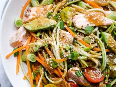 Spiralize zucchini and carrots. Cut remaining vegetables accordingly and toss with zucchini, carrots and quinoa. Break apart the salmon and carefully toss it together with vegetables.