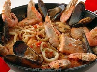 Pelar y picar las cebollas. Pelar y picar el ajo sin el brote central. Limpiar, despepitar, desvenar y picar los pimientos. Rehogar las verduras en aceite de oliva. Incorporar los tomates despepitados y cortados en cubos parejos. Bañar con el vino y el caldo necesario. Perfumar con las hebras de azafrán, sal y pimienta. Cocinar unos minutos y agregar los mariscos limpios y el pescado reservado. Calentar antes de servir.