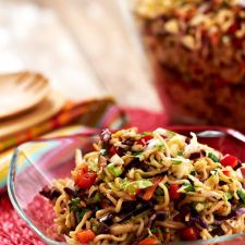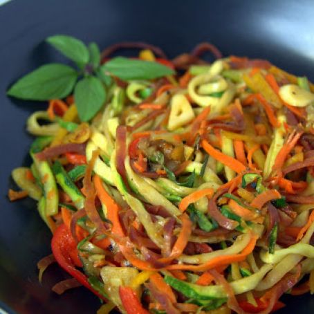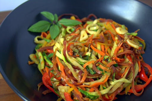 1. Heat up a pan. Take olive oil and add garlic, veggetti noodles, red bell peppers, green scallions, rosemary, and Thai basil leaves. Saute on high heat.