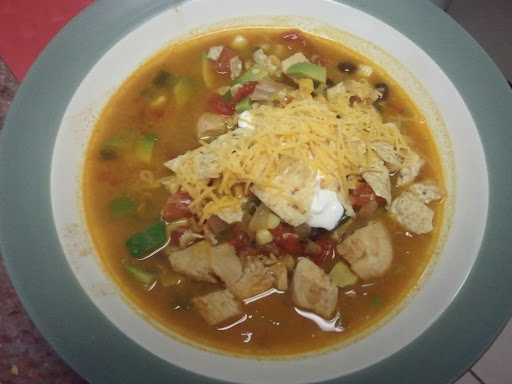 In a large pot, place chicken breasts along with all the seasonings, chicken base, lime juice, onion and garlic. Bring to a boil until chicken is tender (about 15 min.). Remove chicken from broth and add tomatoes and corn mix. Bring to a boil again. Add ½ cup tortilla chips to thicken. Chop chicken and add back to pot. Cook 5 additional minutes. To serve, add soup to serving bowl and top with cheese, sour cream avocado and tortilla chips.