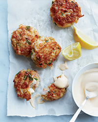 In a large bowl, mix the chopped shrimp with the panko, eggs, scallions, lemon zest, smoked paprika, 1 teaspoon of salt and 1/2 teaspoon of pepper. Form the mixture into eight 3/4-inch-thick cakes.