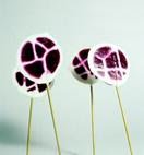 1. Line a freezer tray with a Silpat liner. Draw a 1 ½" diameter circle with the yogurt mousse and then fill the center in by drawing a type of latticework. Set the kebab sticks in one end of the circle to make a lollipop pop and then freeze.