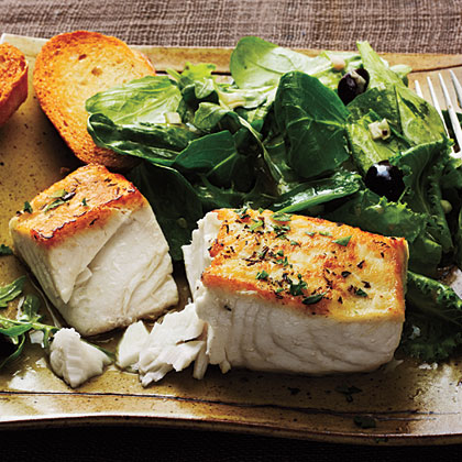Halibut à la Provençal over Mixed Greens with Toasted Garlic Bread