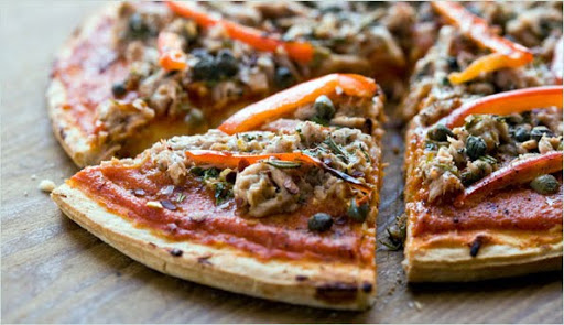 4. Spread the tomatoes or tomato sauce over the pizza. Distribute the tuna over the tomato sauce. Sprinkle on the remaining thyme and rosemary, the pepper flakes, capers and strips of sweet red pepper. Drizzle on the olive oil.
