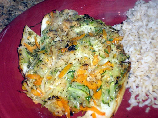 Spread 1 tablespoon pesto over each fillet and top with 1/4 cup each, carrot, zucchini, and cabbage. Sprinkle with 1/4 of the sea salt and black pepper and one minced glove of garlic. Drizzle fillet with 1 teaspoon olive oil and 1 teaspoon chicken stock. Fold paper and seal edges with narrow folds. Repeat with the remaining parchment paper, fish, and vegetables.