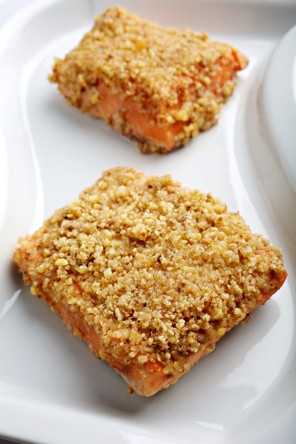 Use tongs or your hands to press the top of each fillet onto the plate of walnuts, making sure to coat the top evenly and completely. Arrange each coated fillet in the baking dish. Bake for 10 to 12 minutes or to the desired degree of doneness.