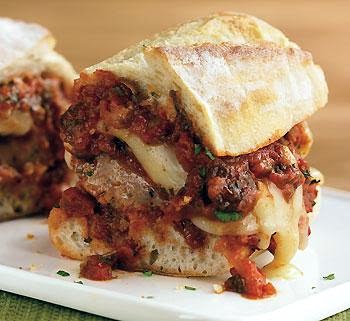 Place baguette bottoms on baking sheet; spread each with about 2 tablespoons sauce from skillet. Cut meatballs in half in skillet; overlap 4 halves on each baguette bottom. Spoon remaining sauce over meatballs, then sprinkle mozzarella over, dividing equally. Bake until cheese melts, about 5 minutes. Sprinkle with remaining parsley and basil and cover with baguette tops.