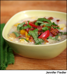 4. Crumble the crisped bacon. Portion the soup into 4 bowls and top with cherry tomatoes, crumbled bacon and basil and serve immediately. Serves 4.