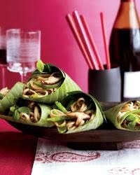 2. In a very large, deep skillet, heat 2 tablespoons of the canola oil until shimmering. Add the shiitake and cook over moderately high heat, undisturbed, until browned, about 5 minutes. Add the remaining 1 tablespoon of canola oil, the scallions and ginger and stir-fry until the scallions soften, about 3 minutes. Add the water and cook over moderate heat, scraping up the browned bits from the bottom of the pan, 1 minute. Add the noodles, snow peas and soy sauce mixture to the skillet and cook, tossing the noodles until heated through, about 2 minutes. Add the cilantro, transfer to banana leaf cones or bowls and serve.