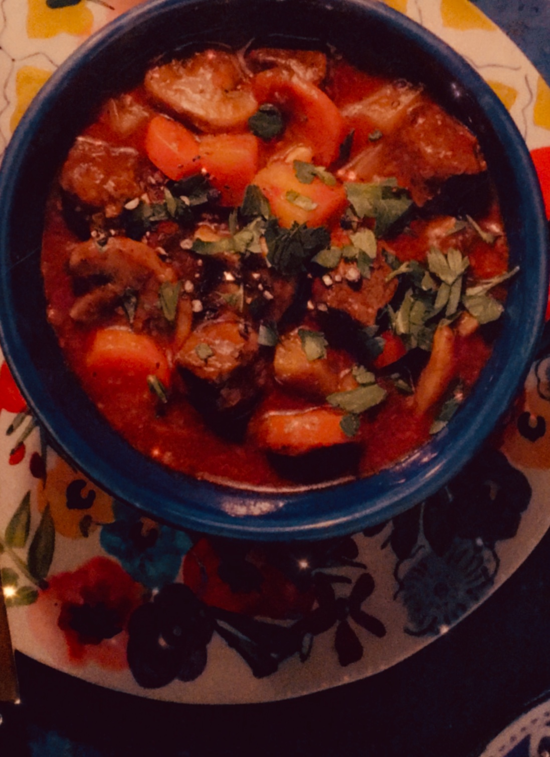 We turn beef to pot add broth diced tomatoes beer tomato paste salt pepper and thyme Bring to a boil reduce heat and cover and simmer for one hour add carrots and potatoes we turn to boil till potatoes and carrots are tender reduce heat cover and simmer for another 30 minutes