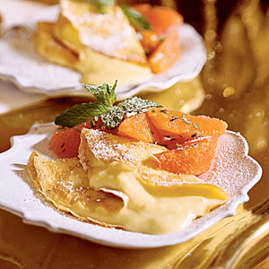 To serve, place 1 crepe on each of 8 dessert plates. Spread about 1/3 cup chilled filling over each crepe. Fold each into a triangle. Top each serving with 1/4 cup fruit mixture. Sprinkle crepes evenly with confectioner's sugar. Garnish with mint sprigs.