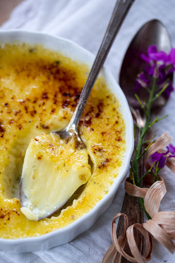 Sprinkle baking sugar onto the tops of the custard, turning and tapping the dish to shake out any excess sugar. Ignite a culinary torch and brulee the sugar until caramelized.