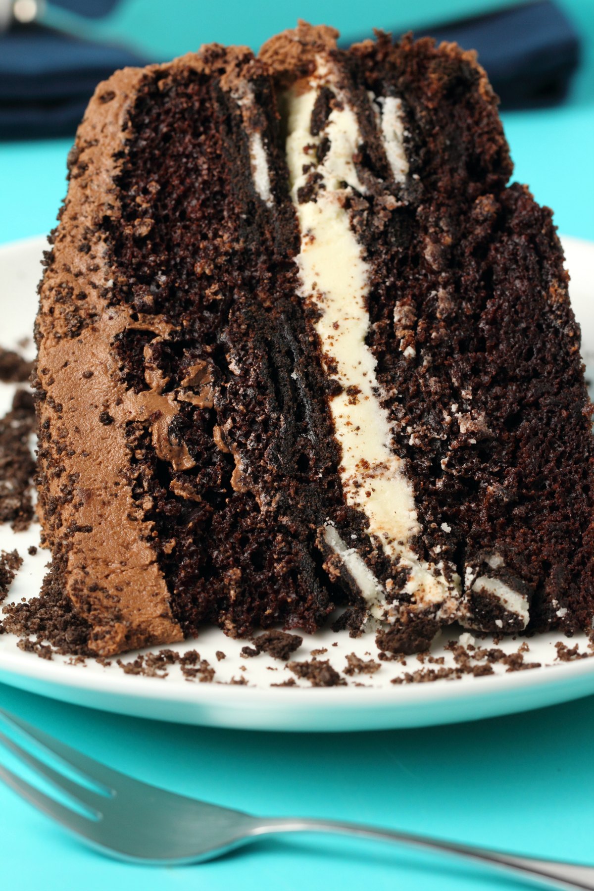 This vegan oreo cake looks like a giant oreo cookie! Oreo cookies are baked into the chocolate cake layers and it has a creamy vanilla center and vegan chocolate buttercream frosting.