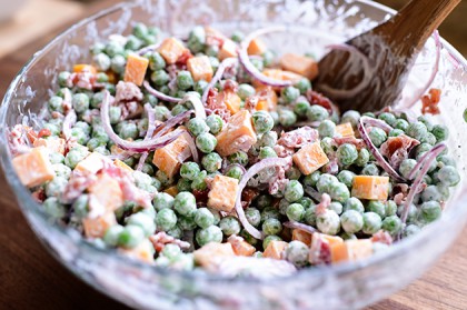 Stir 2/3 of the dressing into the peas until the peas are coated. Gently stir in the bacon, onion, cheese, and parsley until all combined. Taste and adjust seasonings. Cover with plastic wrap and refrigerate 2 to 4 hours before serving. (Pop the extra dressing in the fridge, too.)