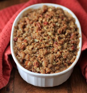 Mix the brown sugar, flour and butter together until crumbly, add the pecans and place on top of sweet potato.