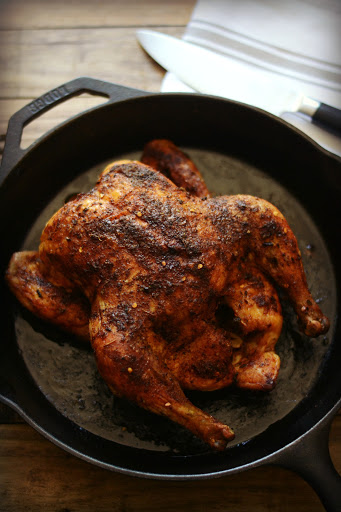 At this time, place the whole chicken, breast side up, into the crock pot or into a cast iron skillet.