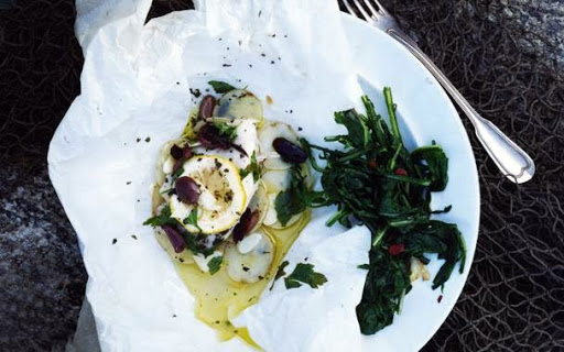 Divide potatoes among parchment squares, arranging them in center, slightly overlapping, then top with a piece of fish. Sprinkle each fillet with a scant 1/4 teaspoon sea salt, then top each with a lemon slice, a few garlic slices and olive slivers, parsley leaves, 1/2 teaspoon oregano, and 1/2 tablespoon oil.