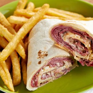 To prepare the wraps, preheat the oven to 350°F. Lay out the flour tortillas on a clean, flat surface. Lay 4 slices of Swiss cheese, 8 slices of corned beef, about 1/4 cup of spread, and 1/4 cup of sauerkraut on the surface of each tortilla, leaving about a 1/2" border.