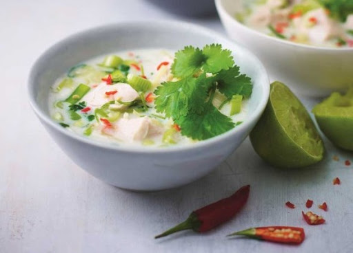 6. Finely slice the onions (both the green and the white bits), juice the limes and roughly chop half of the reserved cilantro leaves. Add these once the chicken is cooked and then leave to simmer for a final minute. Last, add enough fish sauce and sugar to taste.