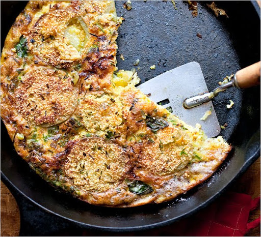 4. Meanwhile, beat the eggs and milk together in a large bowl, and season with salt and pepper (I use about 1/2 teaspoon salt). When the chopped tomatoes have cooked down, turn the heat up to medium-high and pour in the eggs. Swirl the pan to distribute the eggs and filling evenly over the surface. Shake the pan gently, tilting it slightly with one hand while lifting up the edges of the frittata with the spatula in your other hand, letting the eggs run underneath during the first few minutes of cooking. Distribute the fried sliced green tomatoes over the surface of the frittata. Turn the heat down to low, cover and cook 10 minutes, shaking the pan gently every once in a while. From time to time, remove the lid and loosen the bottom with a spatula. Meanwhile, preheat the broiler.