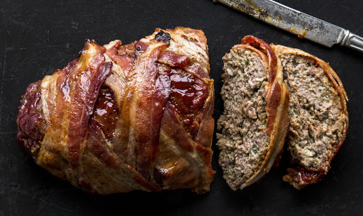 Seasoned stock keeps this meatloaf juicy and flavorful. A doctored ketchup delivers just the right amount of tang, spice, and sweetness. And the bacon? We think it speaks for itself.